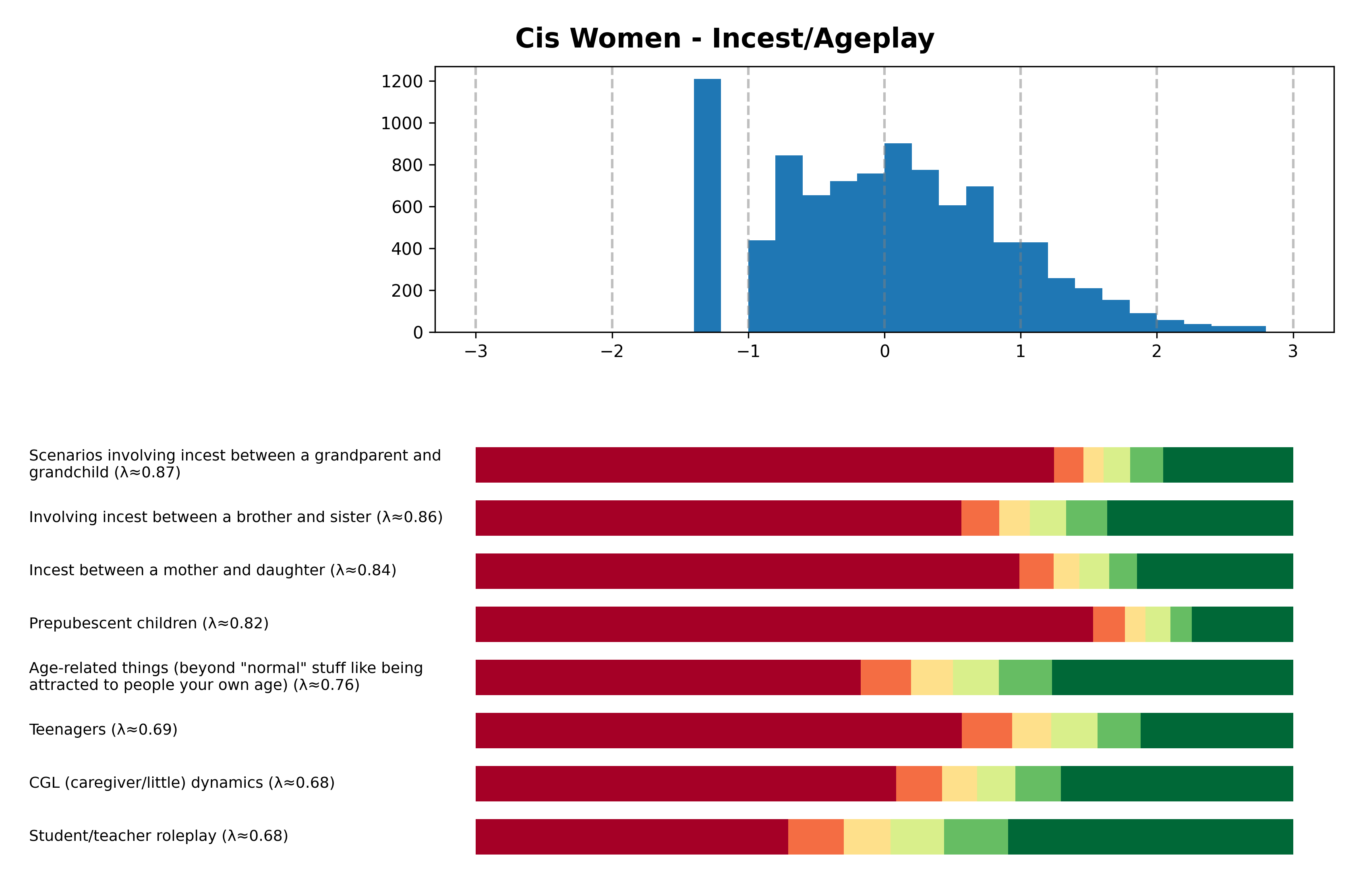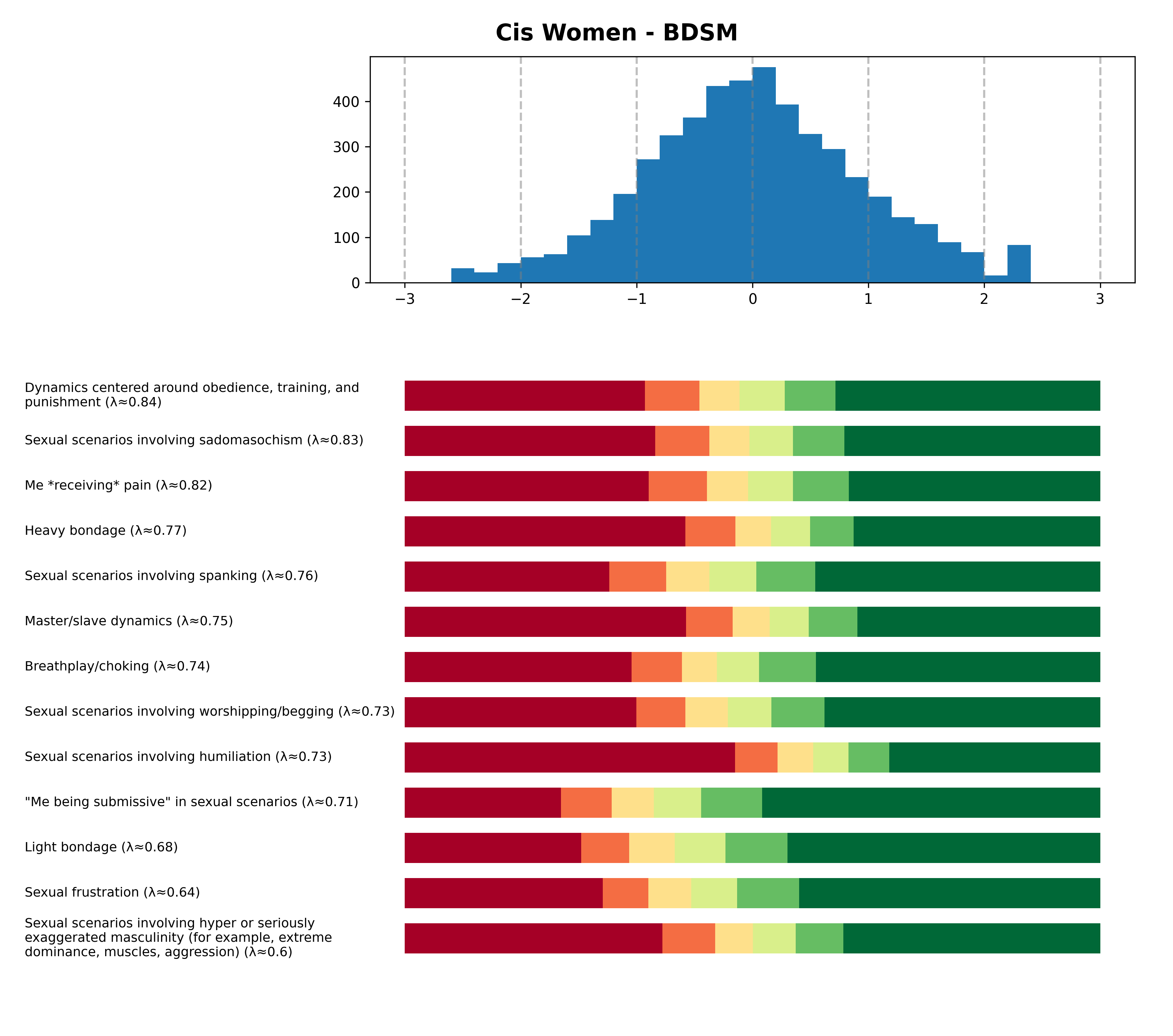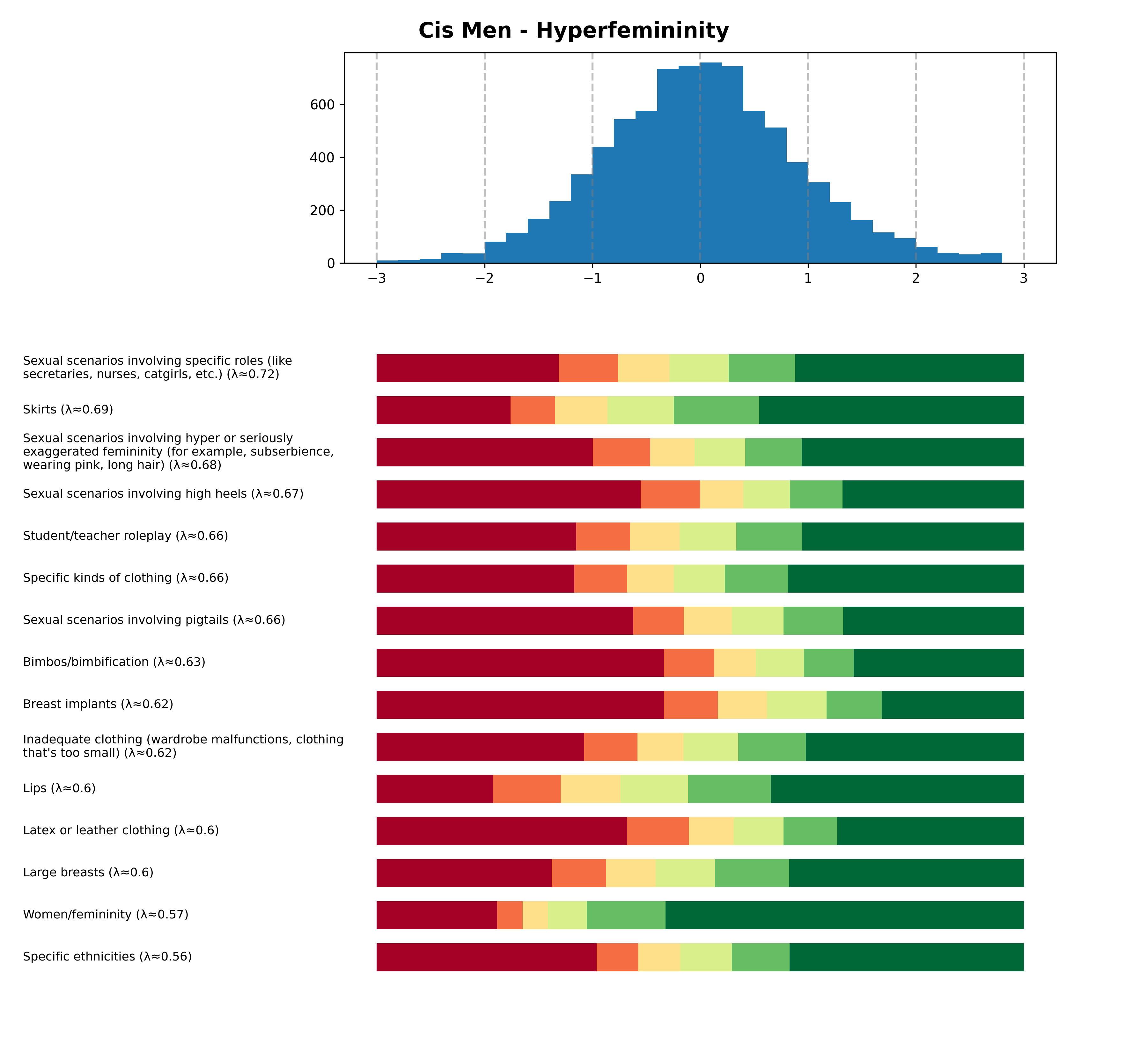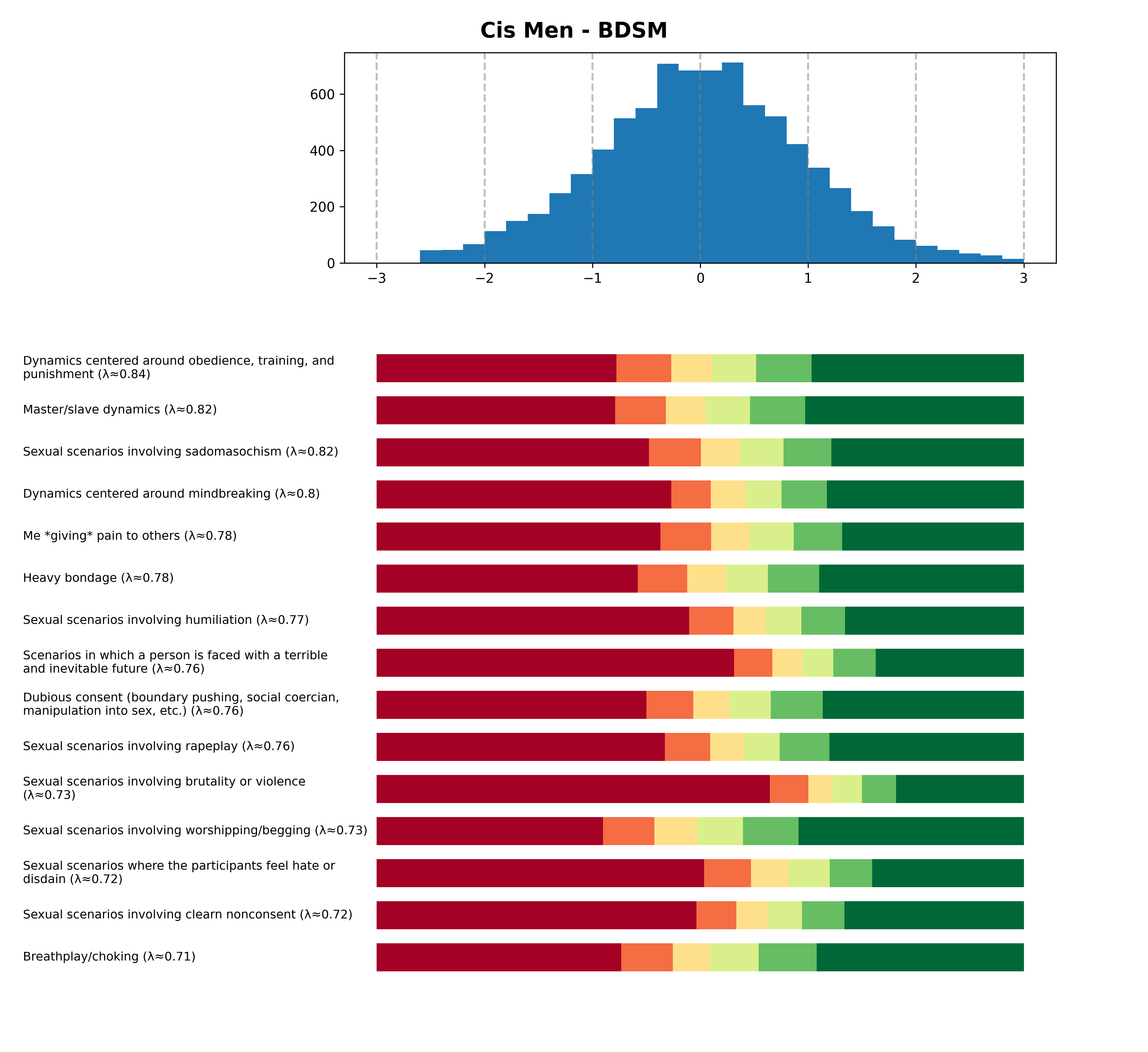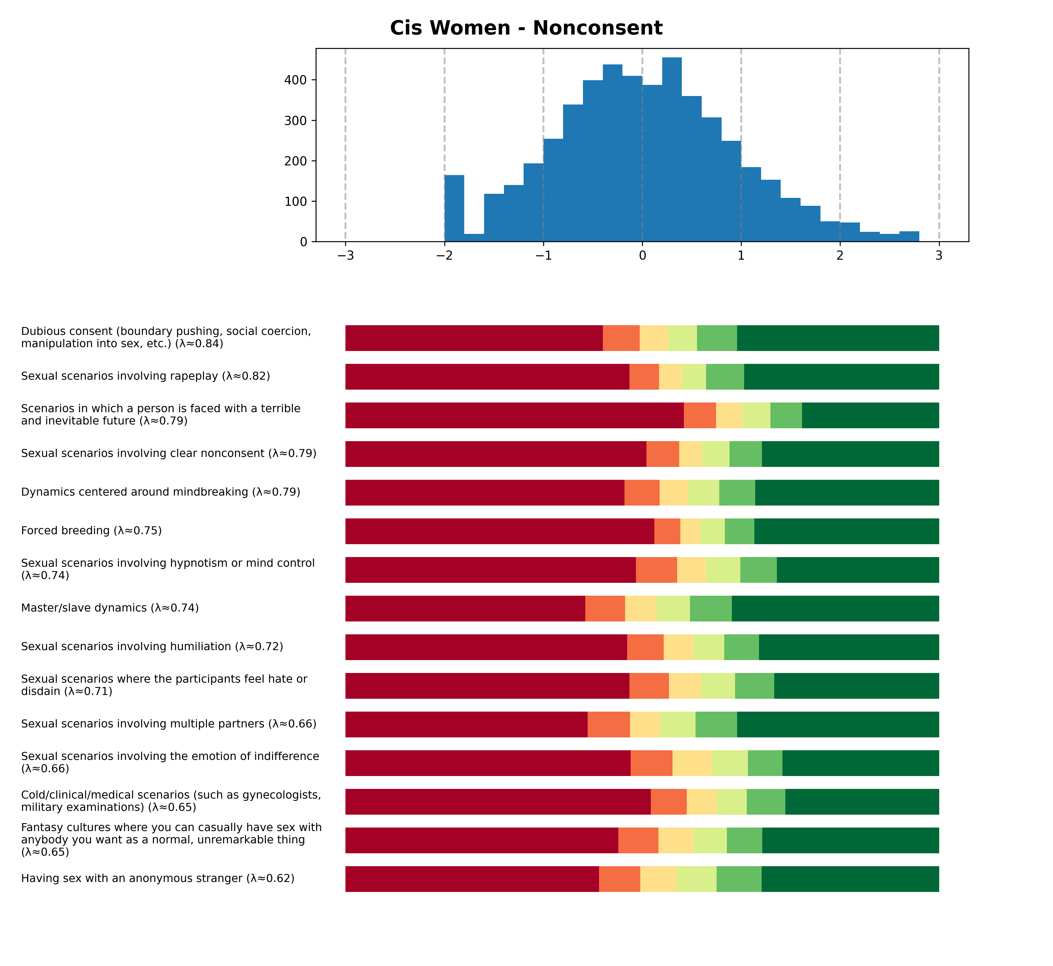 The following plots are what I call “Tailcalled diagrams”. We create a standardized (mean=0, SD=1) latent variable summarizing the displayed items in the bottom of the plot. The rows below the histogram show the median response to each question for a given level of the latent variable. For these plots, while the exact loadings are inflated, the rank orderings are roughly accurate.