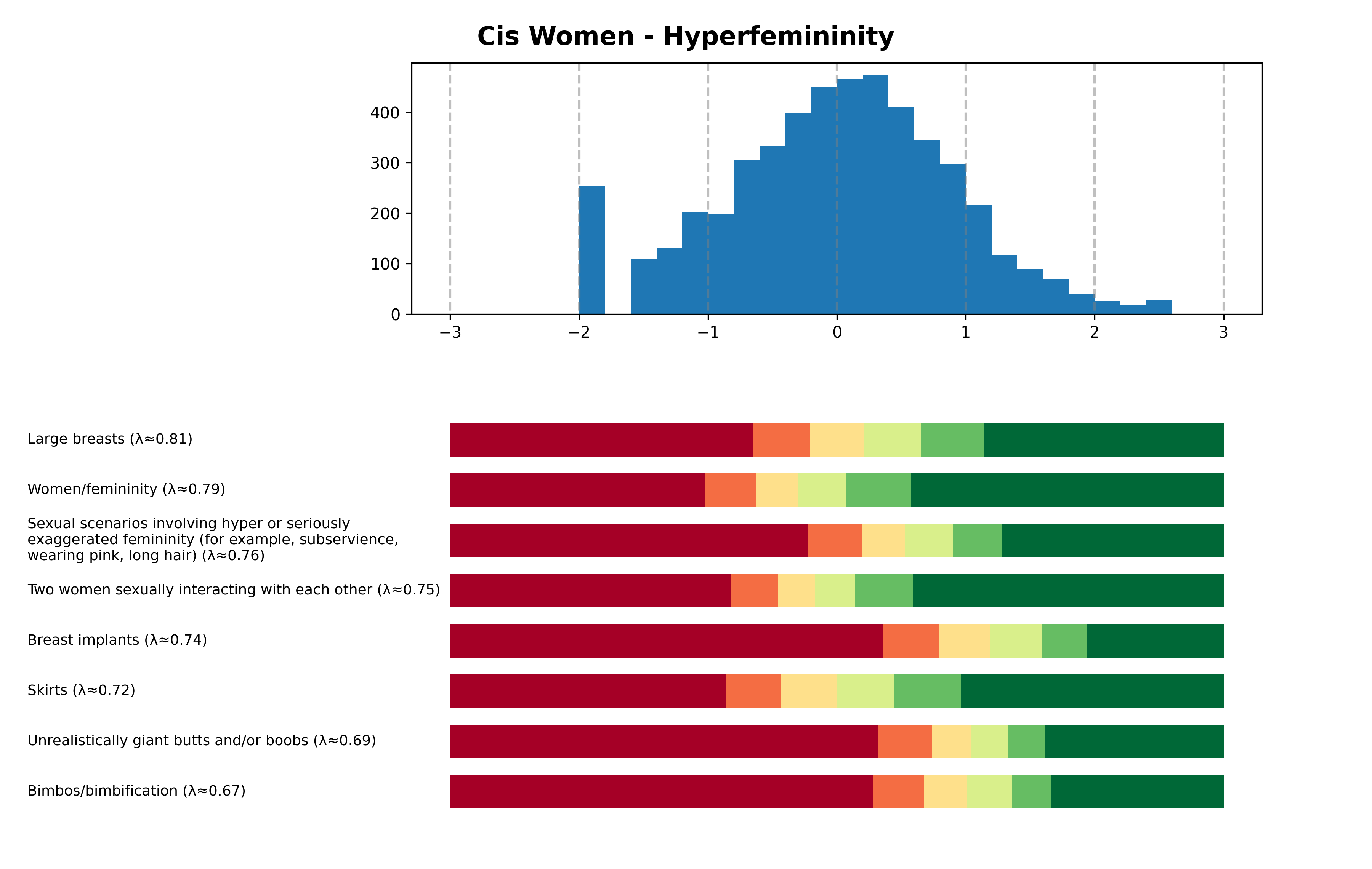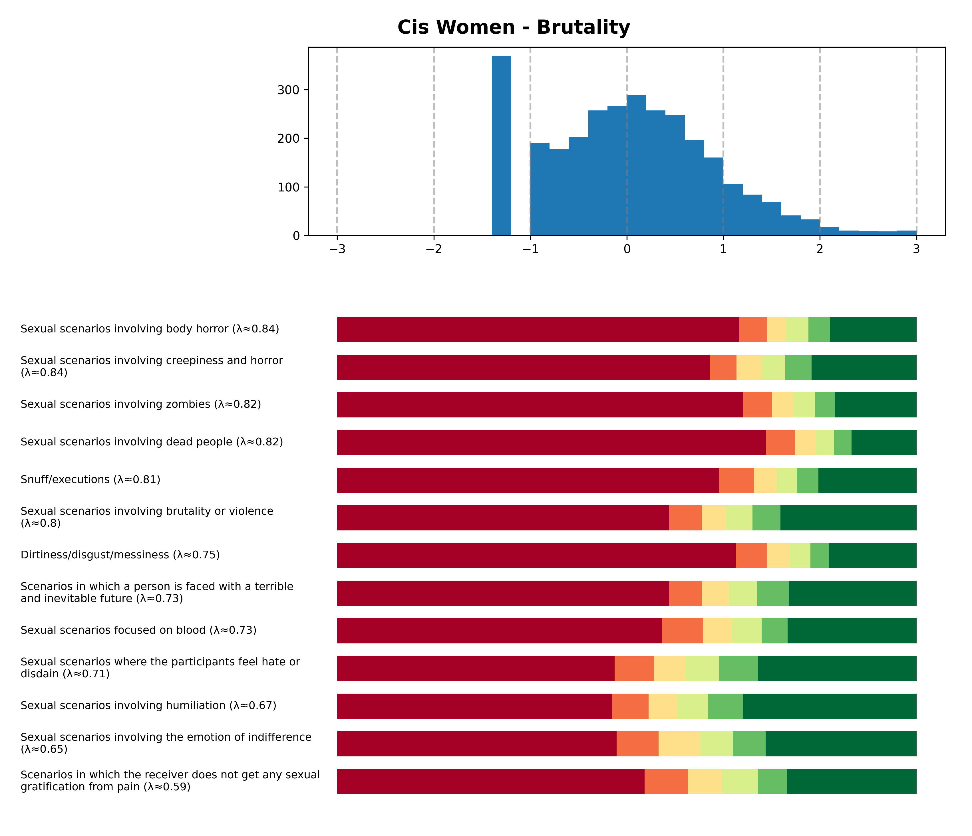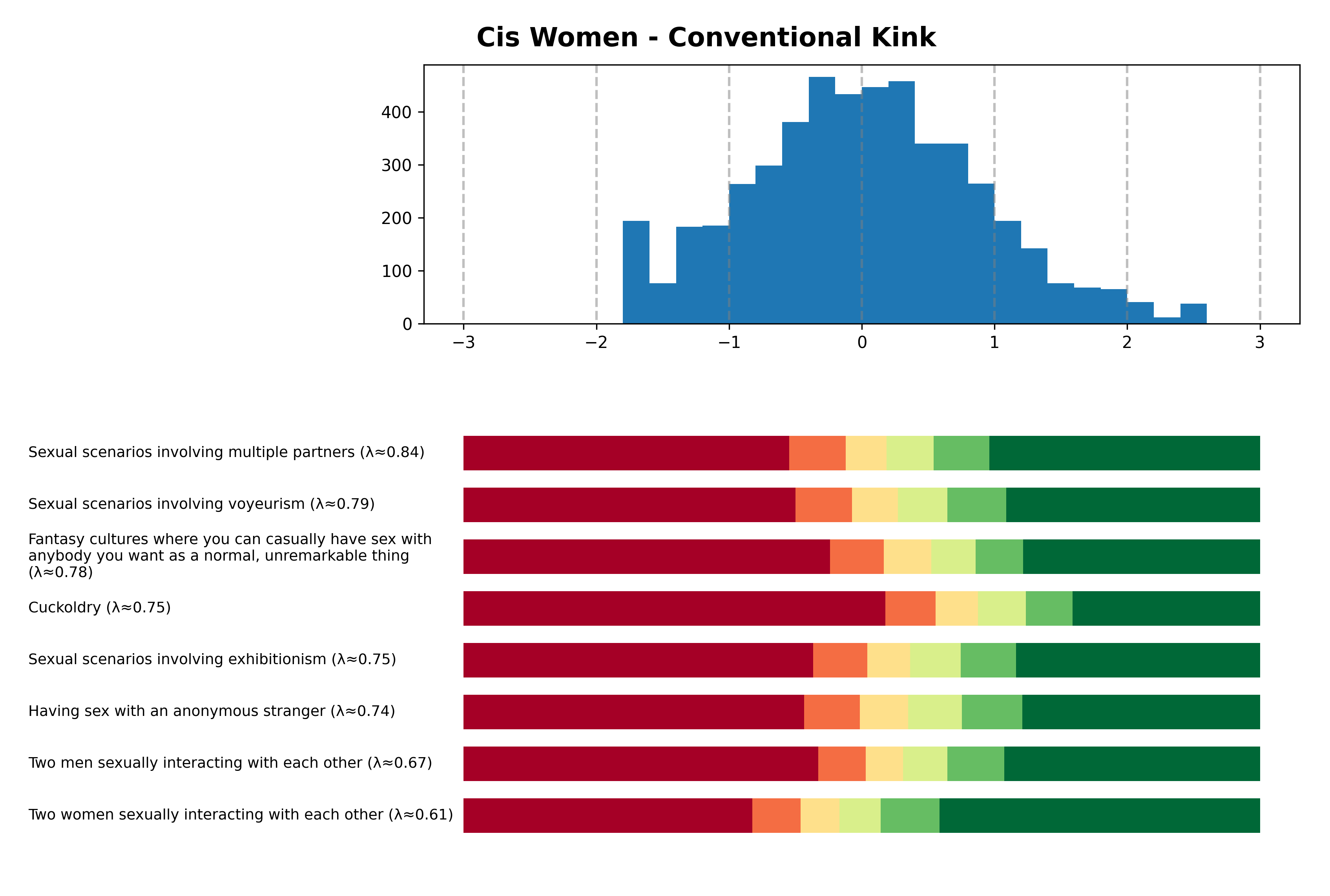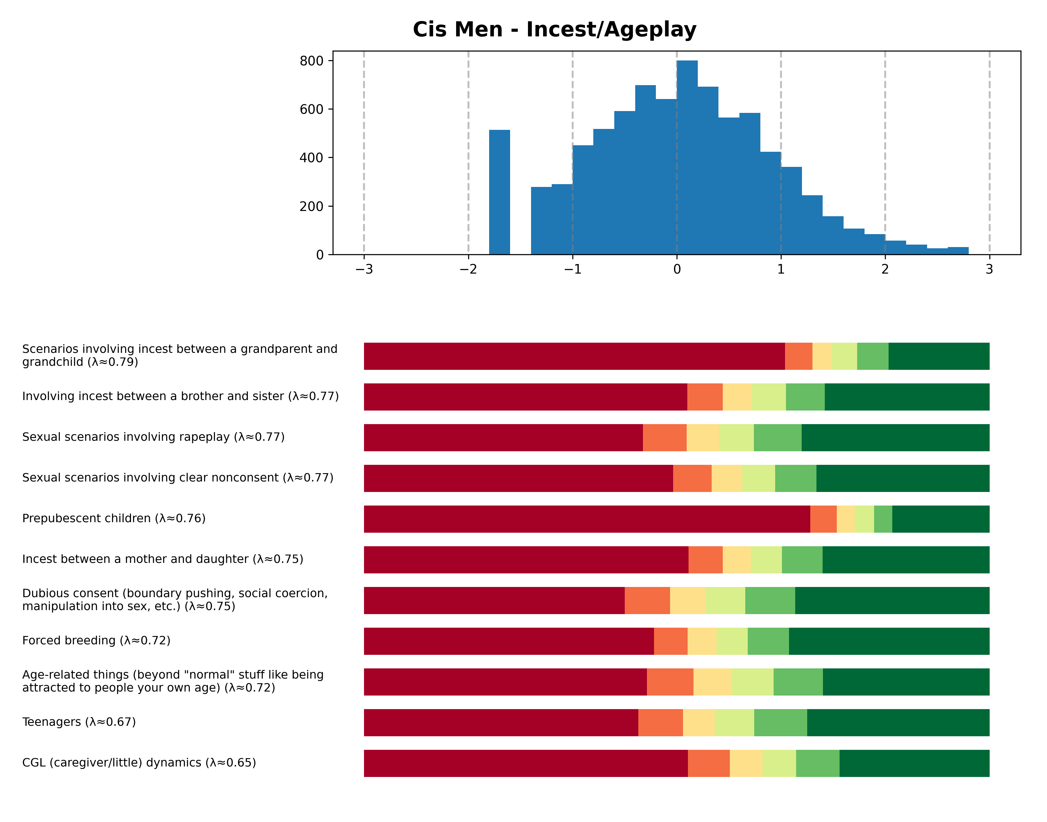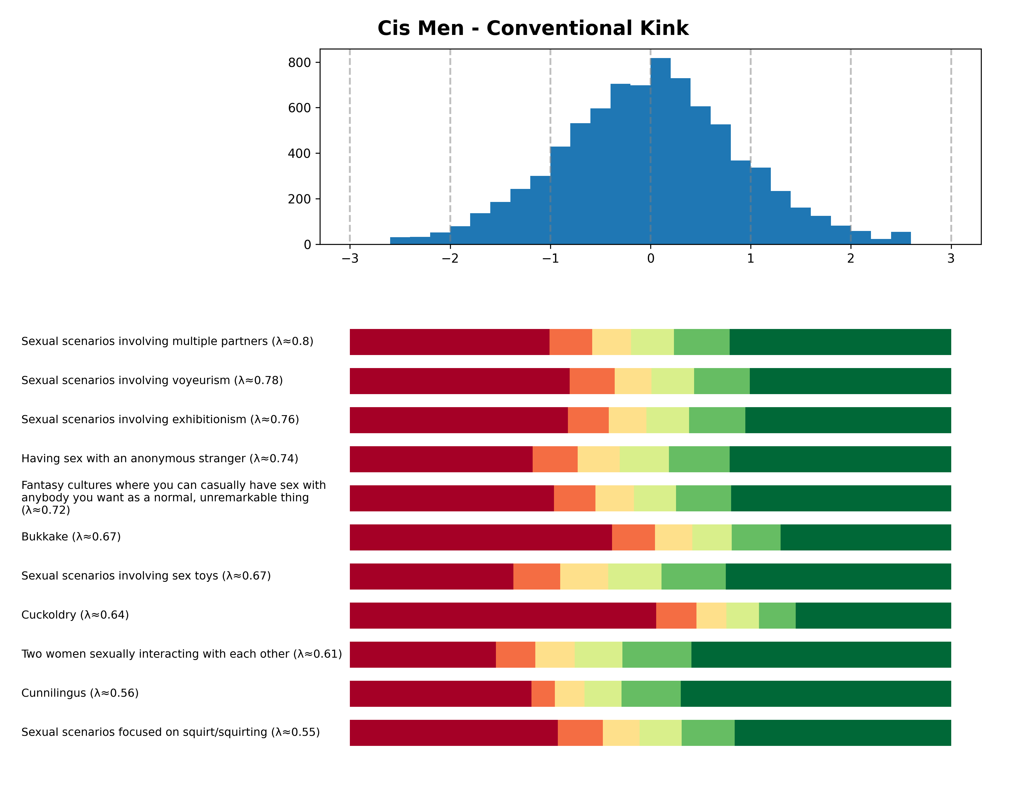 The following plots are what I call “Tailcalled diagrams”. We create a standardized (mean=0, SD=1) latent variable summarizing the displayed items in the bottom of the plot. The rows below the histogram show the median response to each question for a given level of the latent variable. For these plots, while the exact loadings are inflated, the rank orderings are roughly accurate.