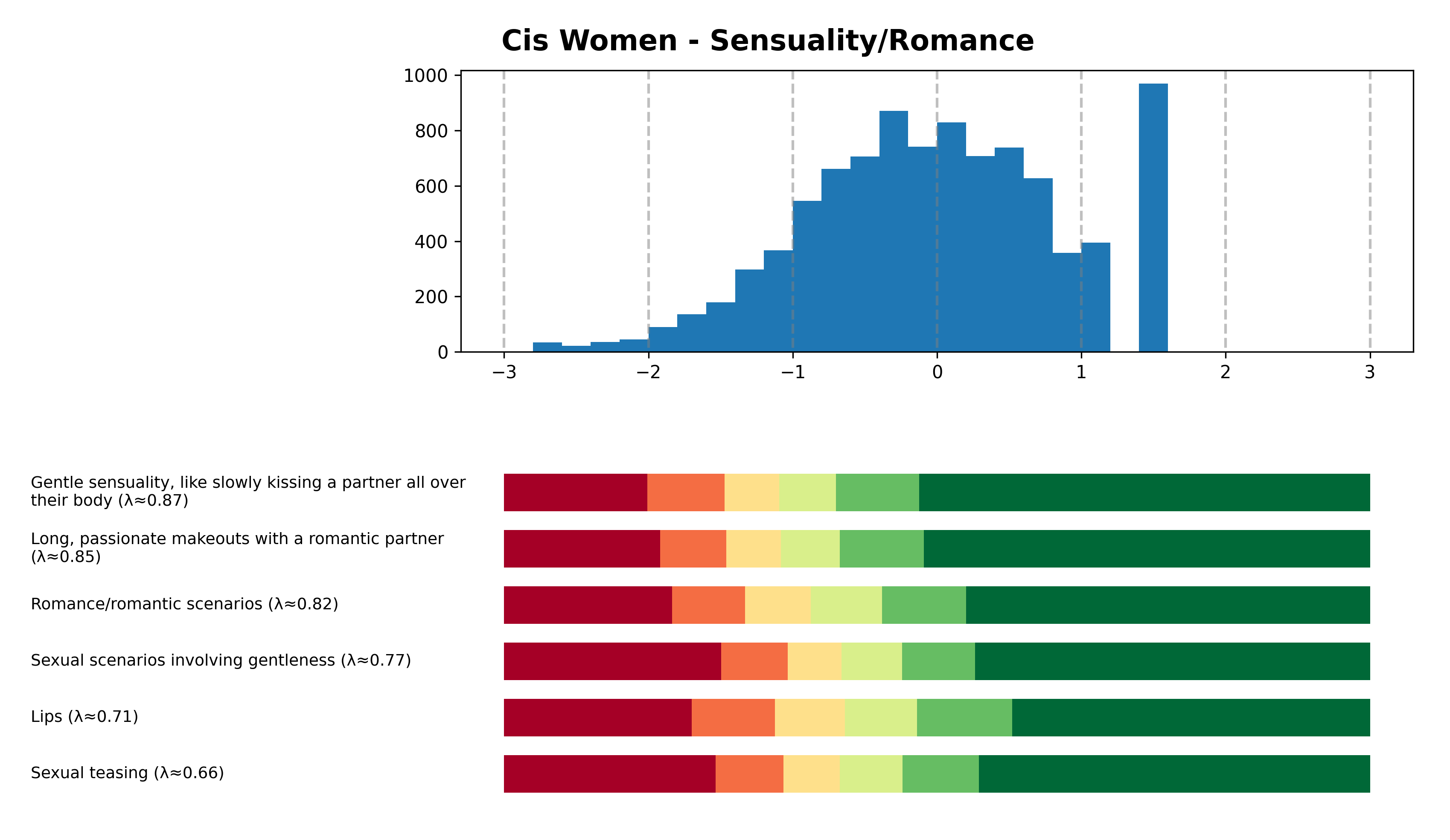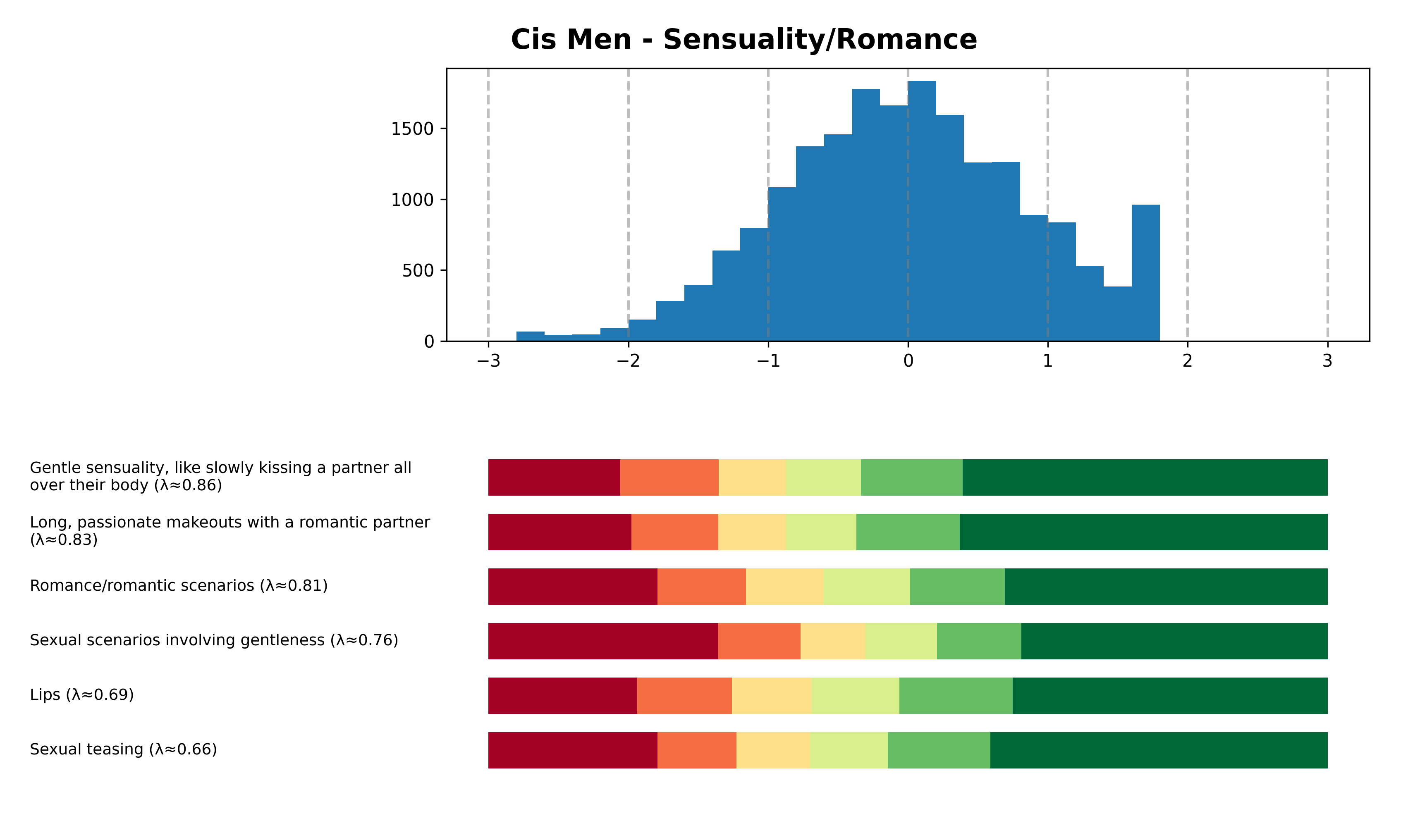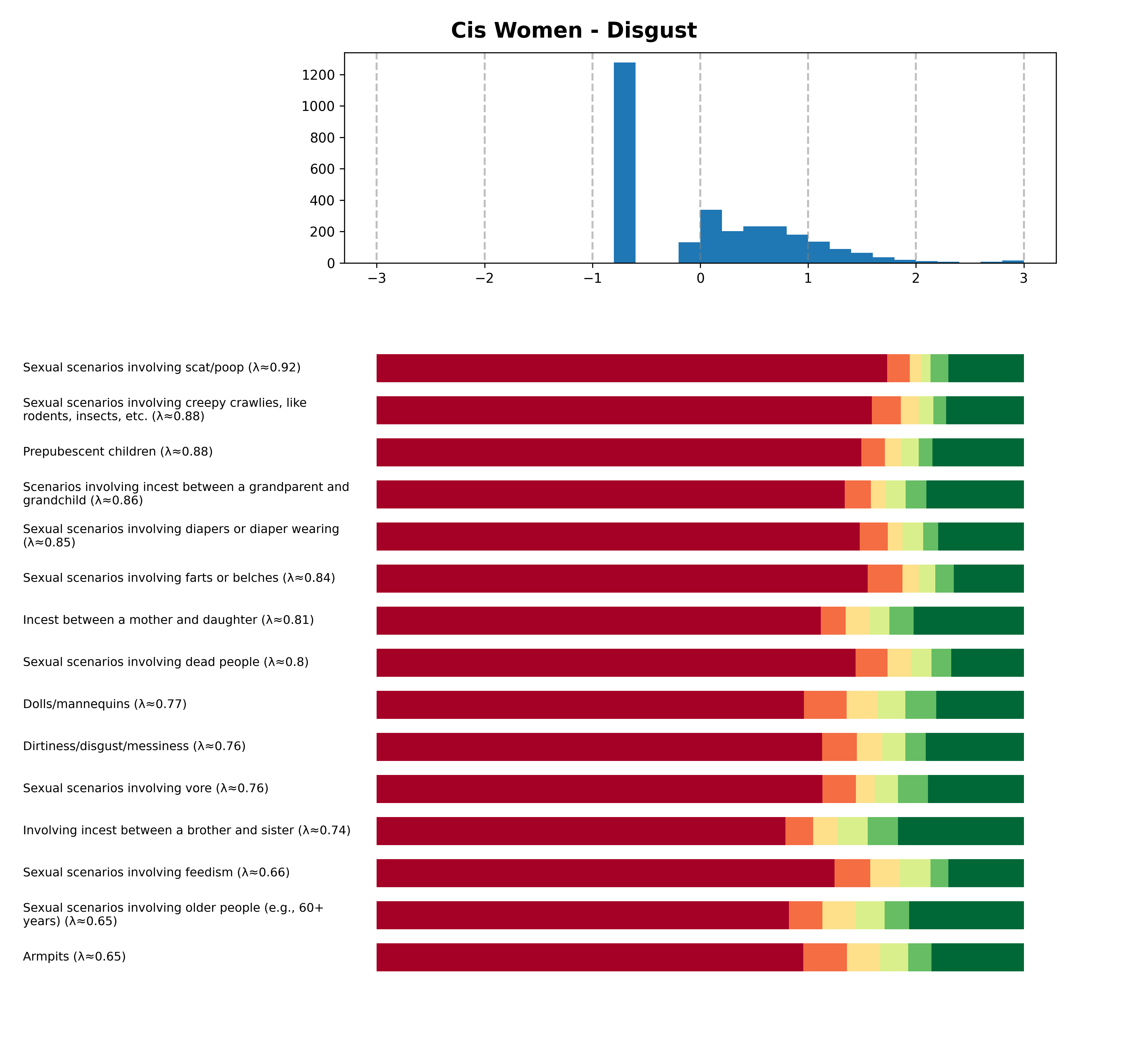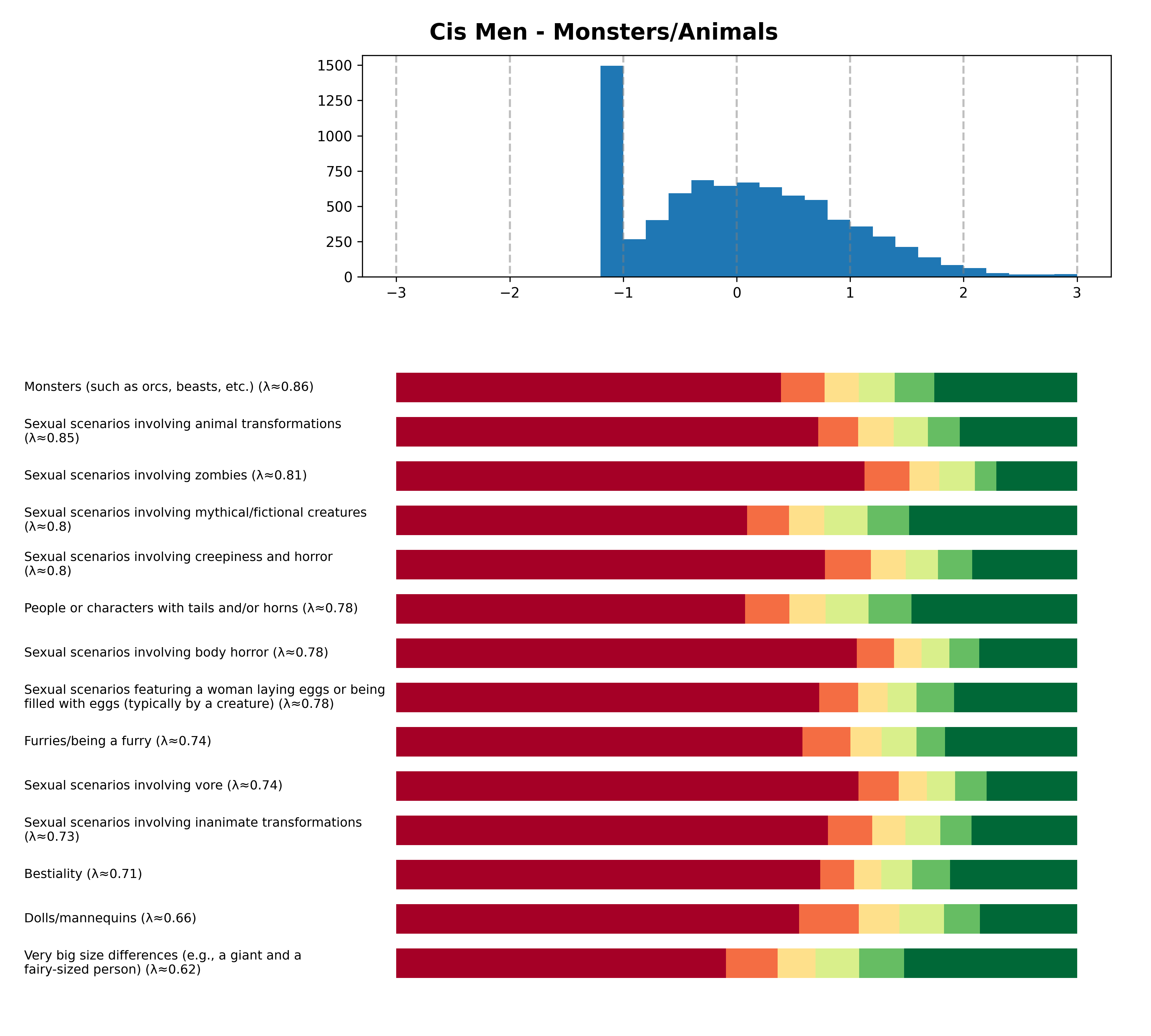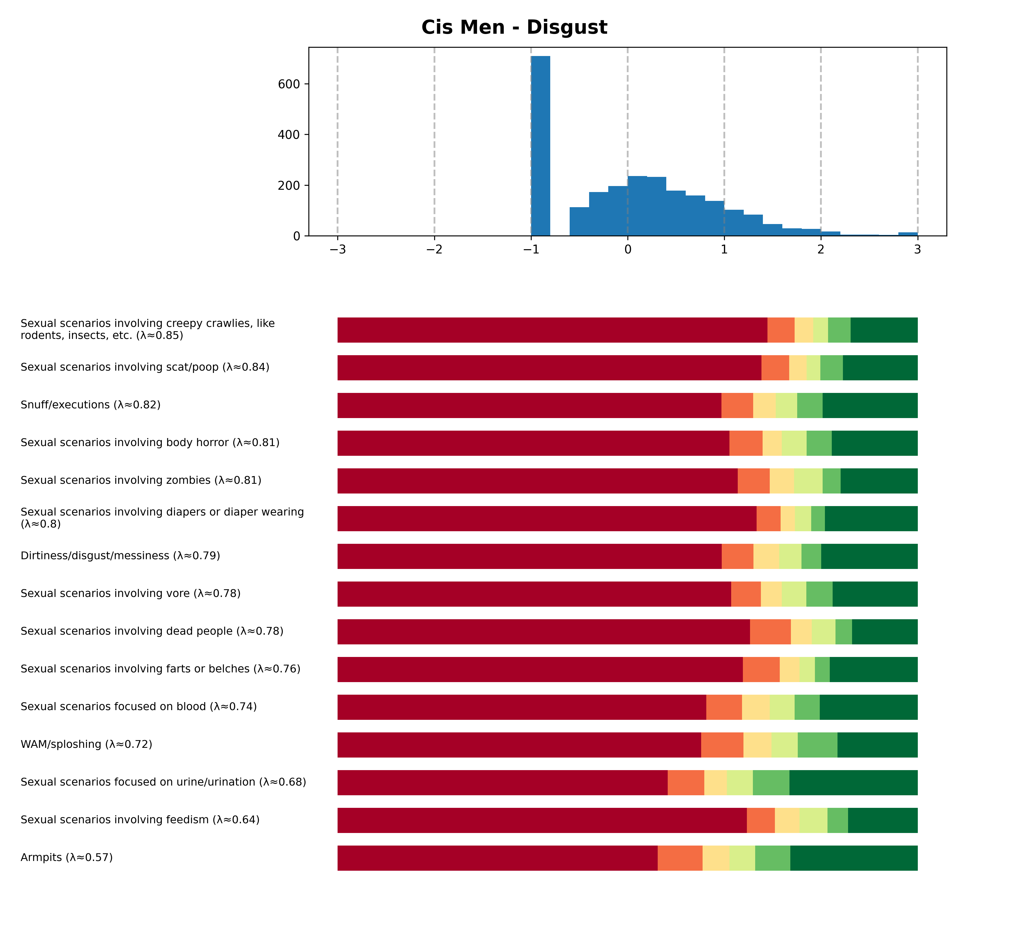 The following plots are what I call “Tailcalled diagrams”. We create a standardized (mean=0, SD=1) latent variable summarizing the displayed items in the bottom of the plot. The rows below the histogram show the median response to each question for a given level of the latent variable. For these plots, while the exact loadings are inflated, the rank orderings are roughly accurate.