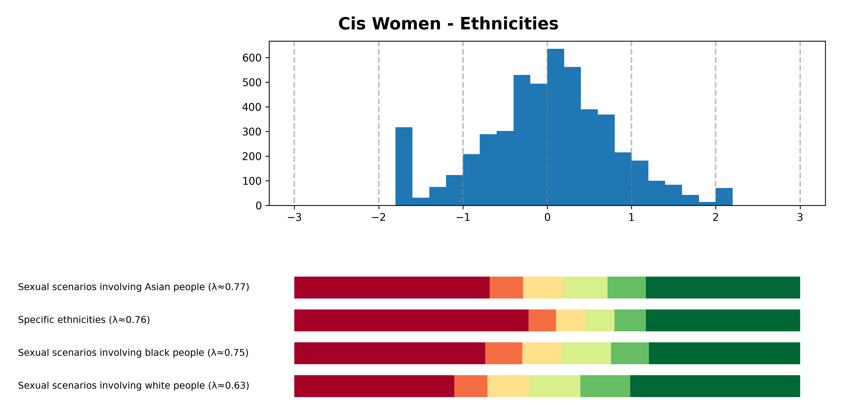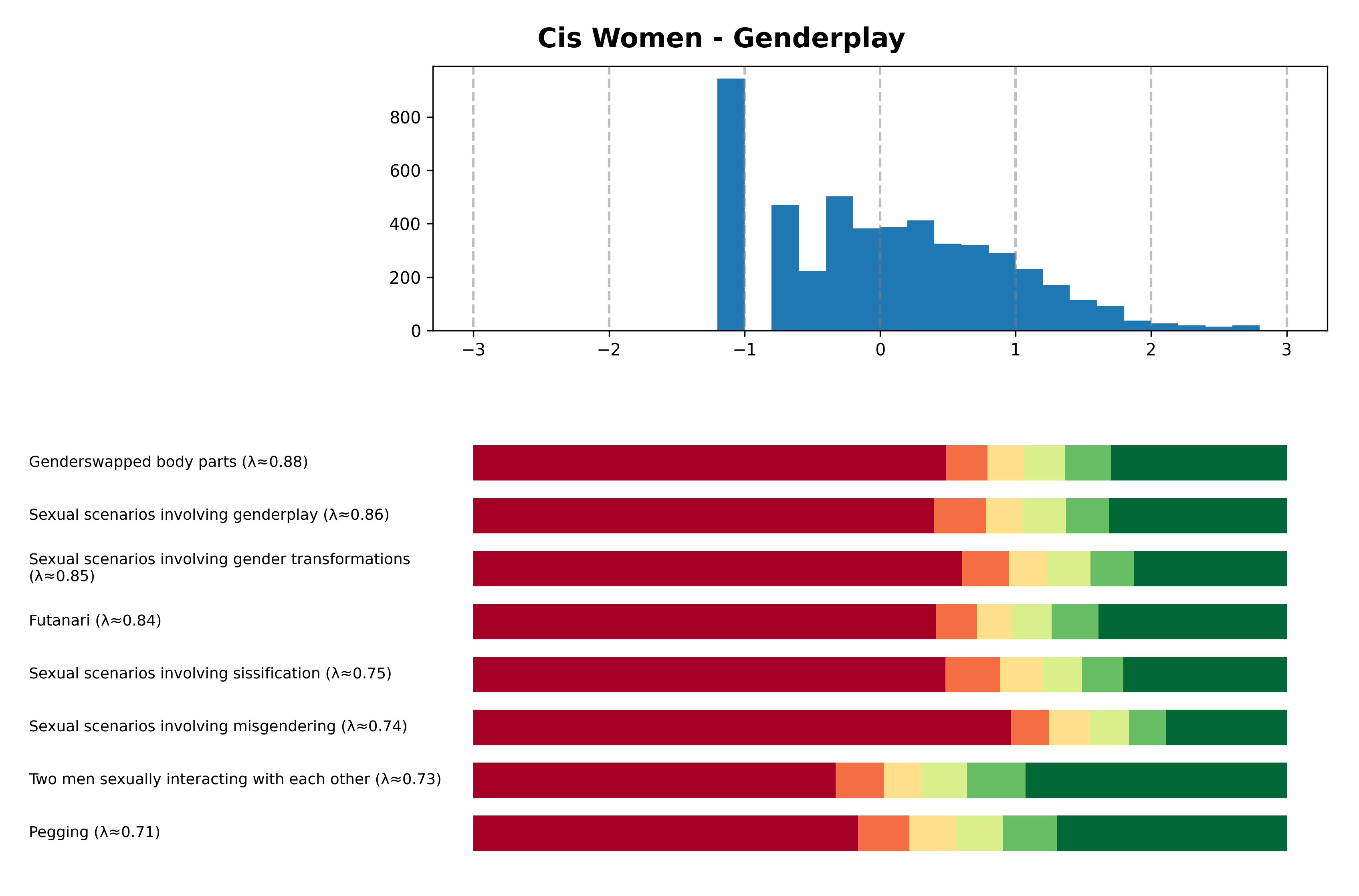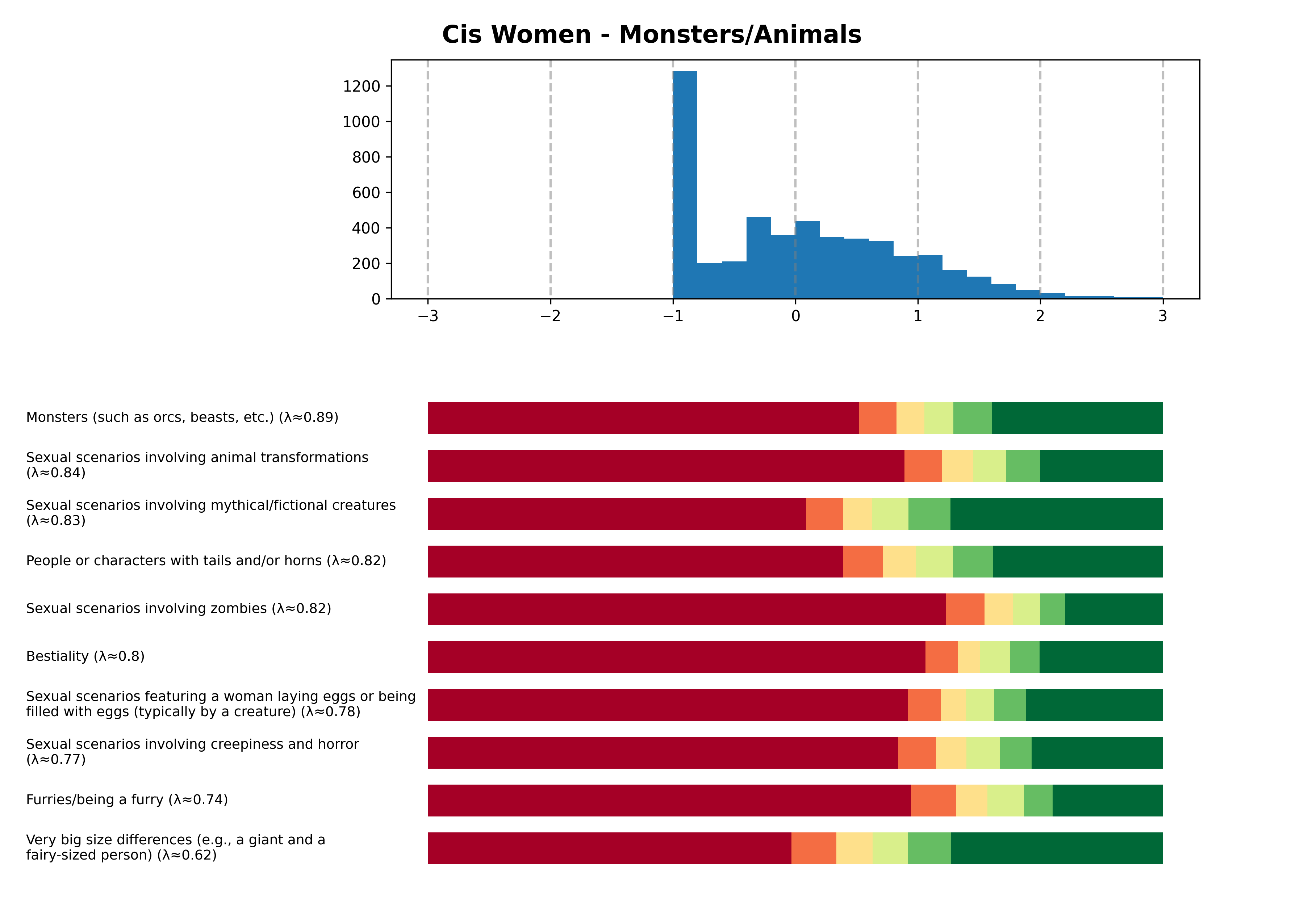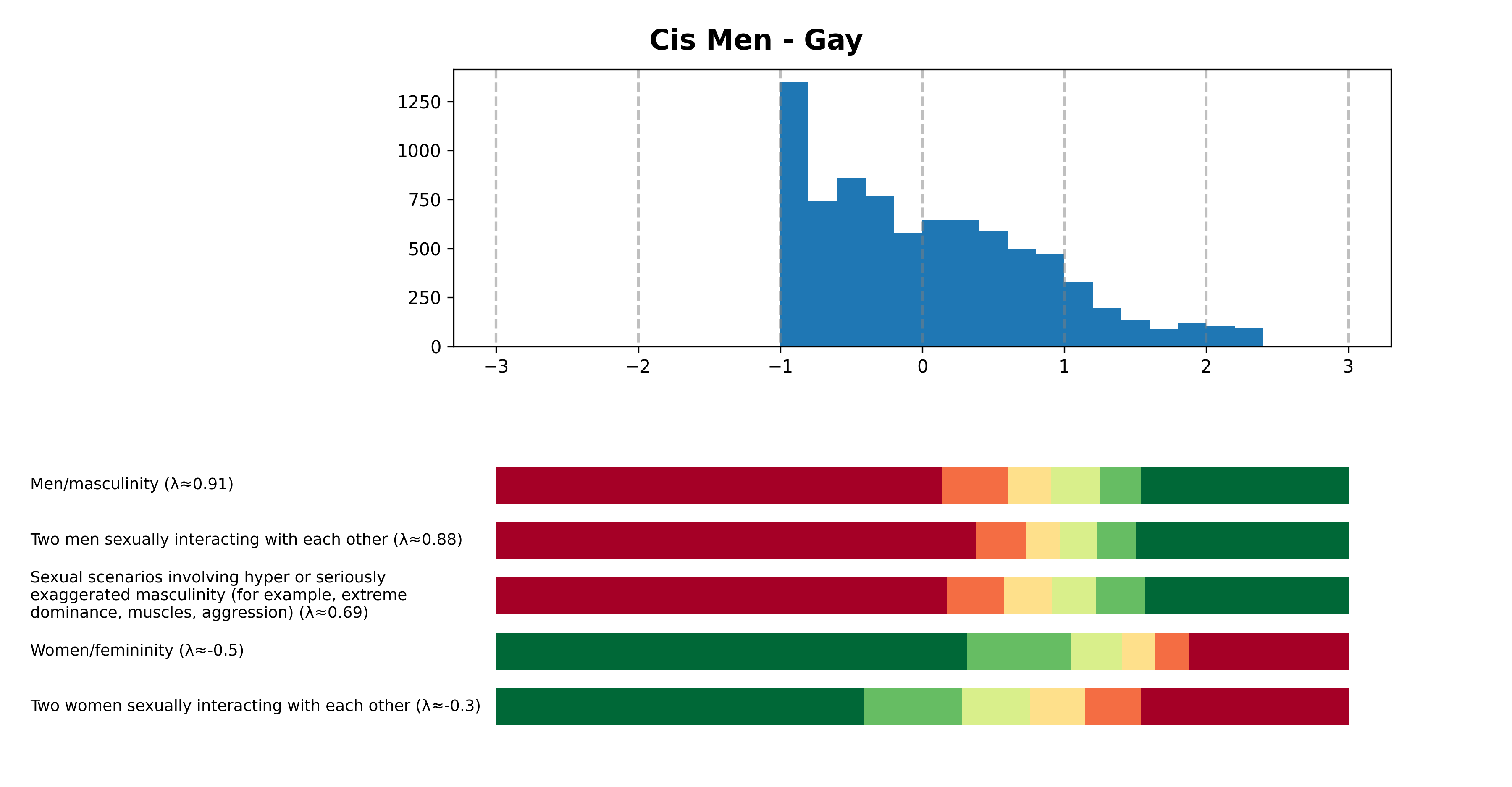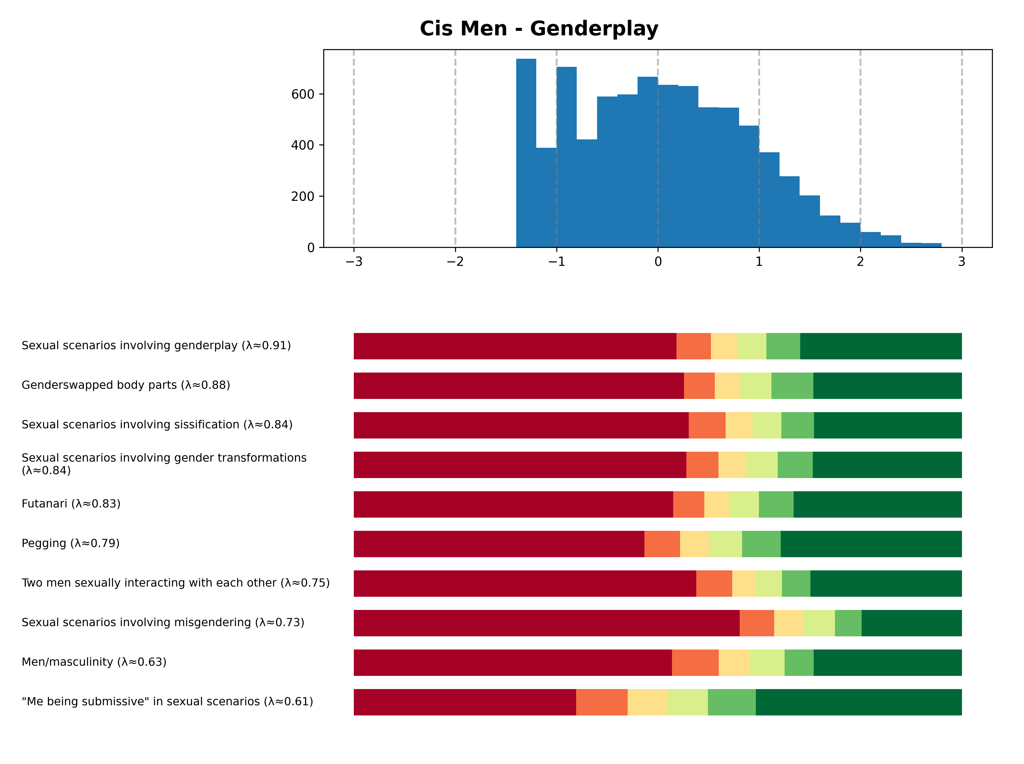 The following plots are what I call “Tailcalled diagrams”. We create a standardized (mean=0, SD=1) latent variable summarizing the displayed items in the bottom of the plot. The rows below the histogram show the median response to each question for a given level of the latent variable. For these plots, while the exact loadings are inflated, the rank orderings are roughly accurate.