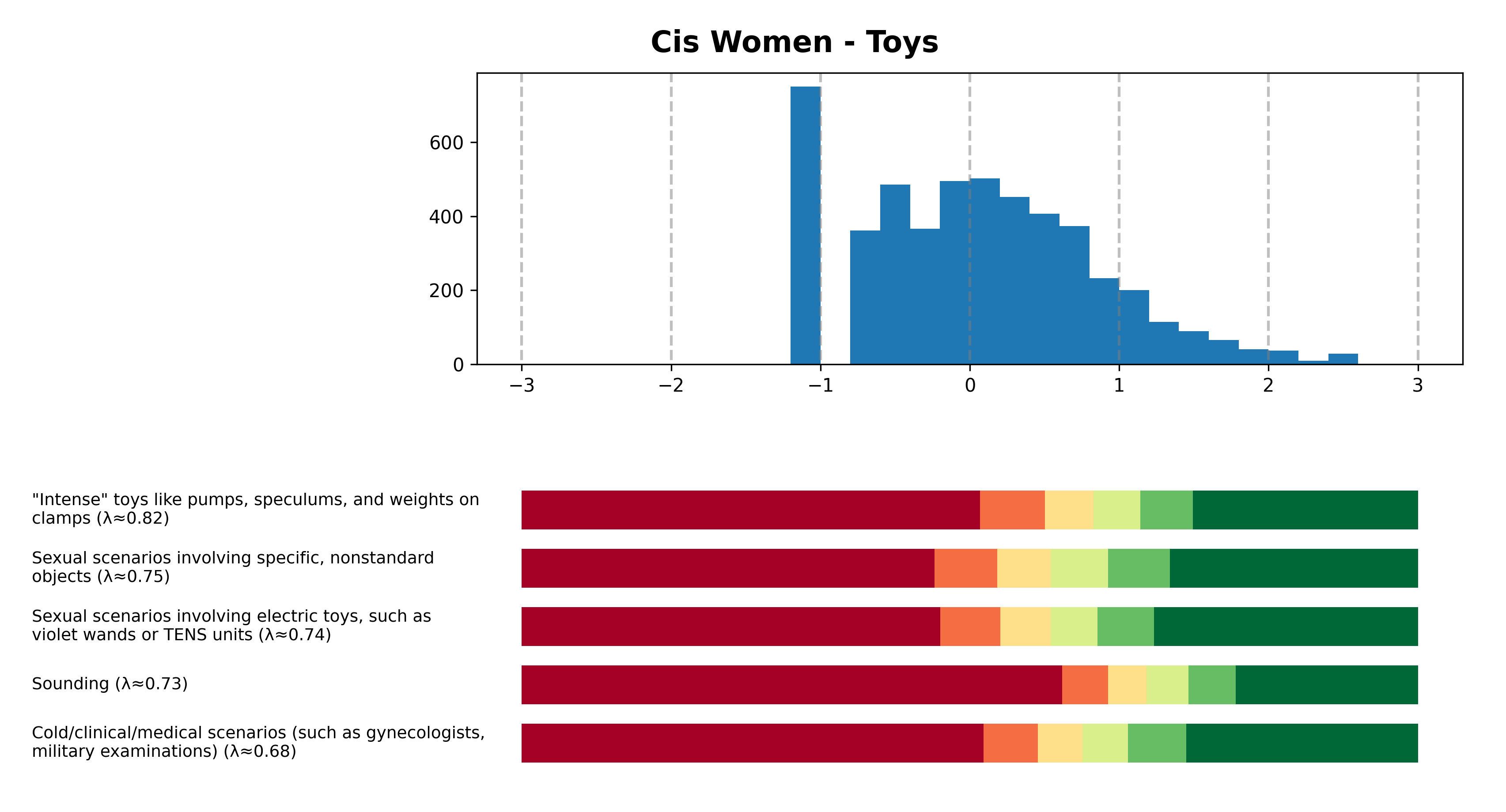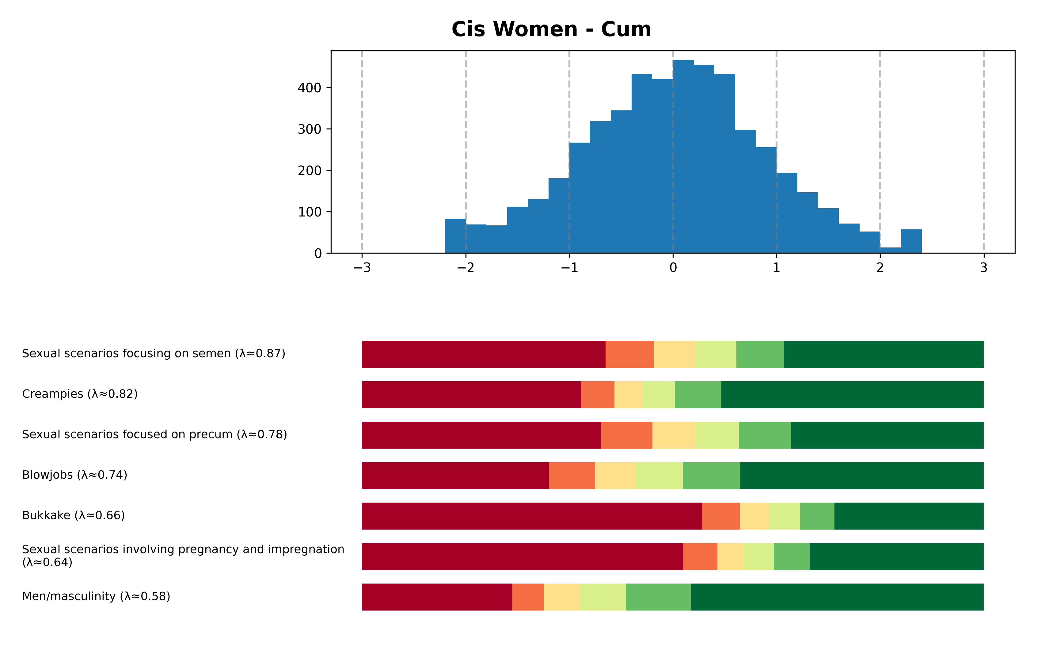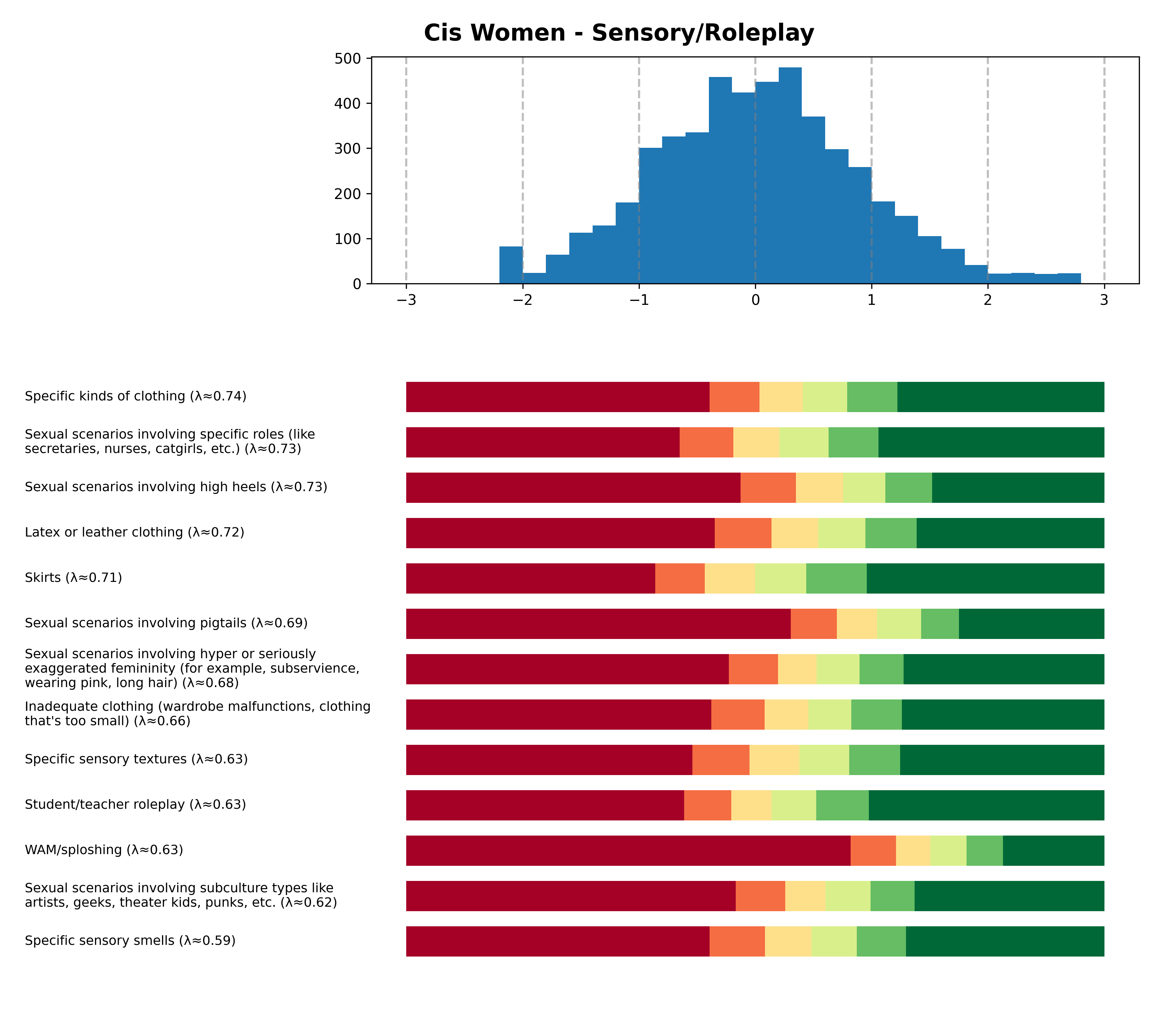 Given biological sex strongly influences sexual preferences, we might expect these factors to differ between men and women. For example, a BDSM factor might emphasize dominance for men and submission for women. Additionally, novel factors may emerge from analyzing men and women separately. To test these hypotheses, I performed separate factor analyses for cis men and cis women. (Trans respondents were excluded due to insufficient sample sizes for reliable analysis.)